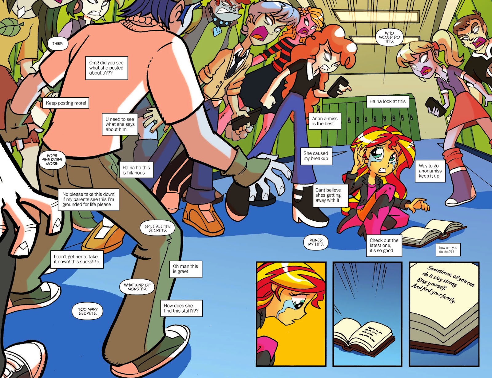 The prolonged, ill-conceived monologue against Anonymous bloggers continues for the duration of the comic, until the very end where it is revealed that it was, of course the CMC who were the ones posting everyone's secrets. The fact that Pony Twilight didn't see the parallels and inform Sunset of them, again begs numerous questions about the logic involved.